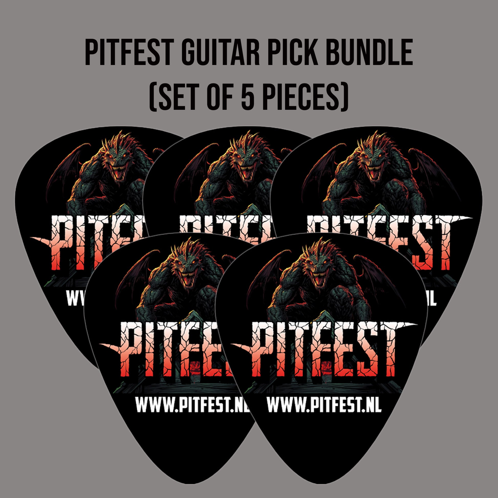 Get a set of 5 official Pitfest guitar picks, all featuring our hellspawn beast and cracked logo. Perfect for shredders, collectors, and people who lose everything after two beers.
